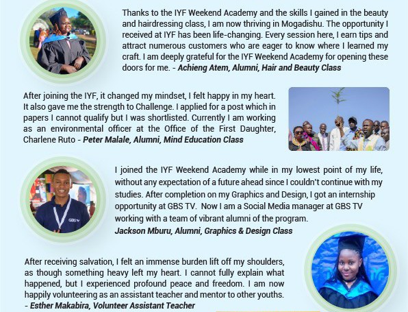 The next intake for the IYF Free Weekend Academy is set to begin on February 22, 2025, at the IYF headquarters along Thika Road.