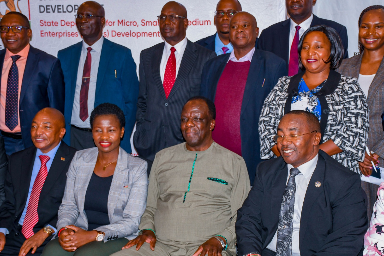 Cabinet Secretary for MSMEs Wycliffe Oparanya,PS Susan Mang’eni with other stakeholders pose for a photo during the unveiling of National Organising Committee for the 25th East African Community (EAC) MSMEs Exhibition and Trade Fair photo:/Dan Kamau -KNA
