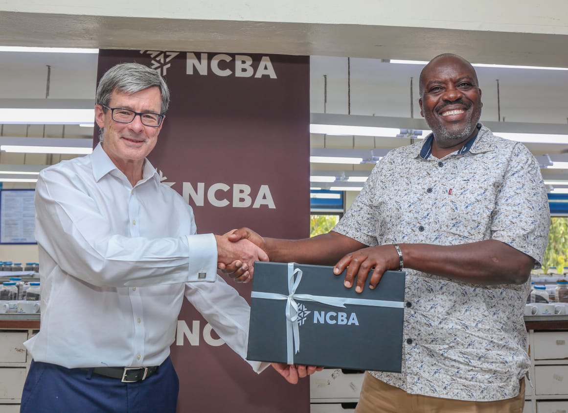 NCBA Managing Director James Gossip handing over a gift humper to peter Gitau of Comborok Limited.