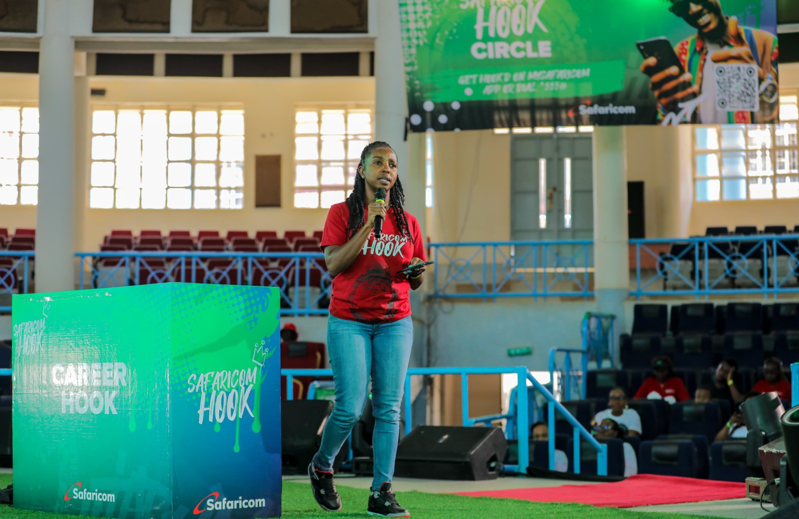 Safaricom PLC HV Postpay Manager Jerusha Okubasu addressing the youth at Kenyatta University during the second Edition of Safaricom Hook